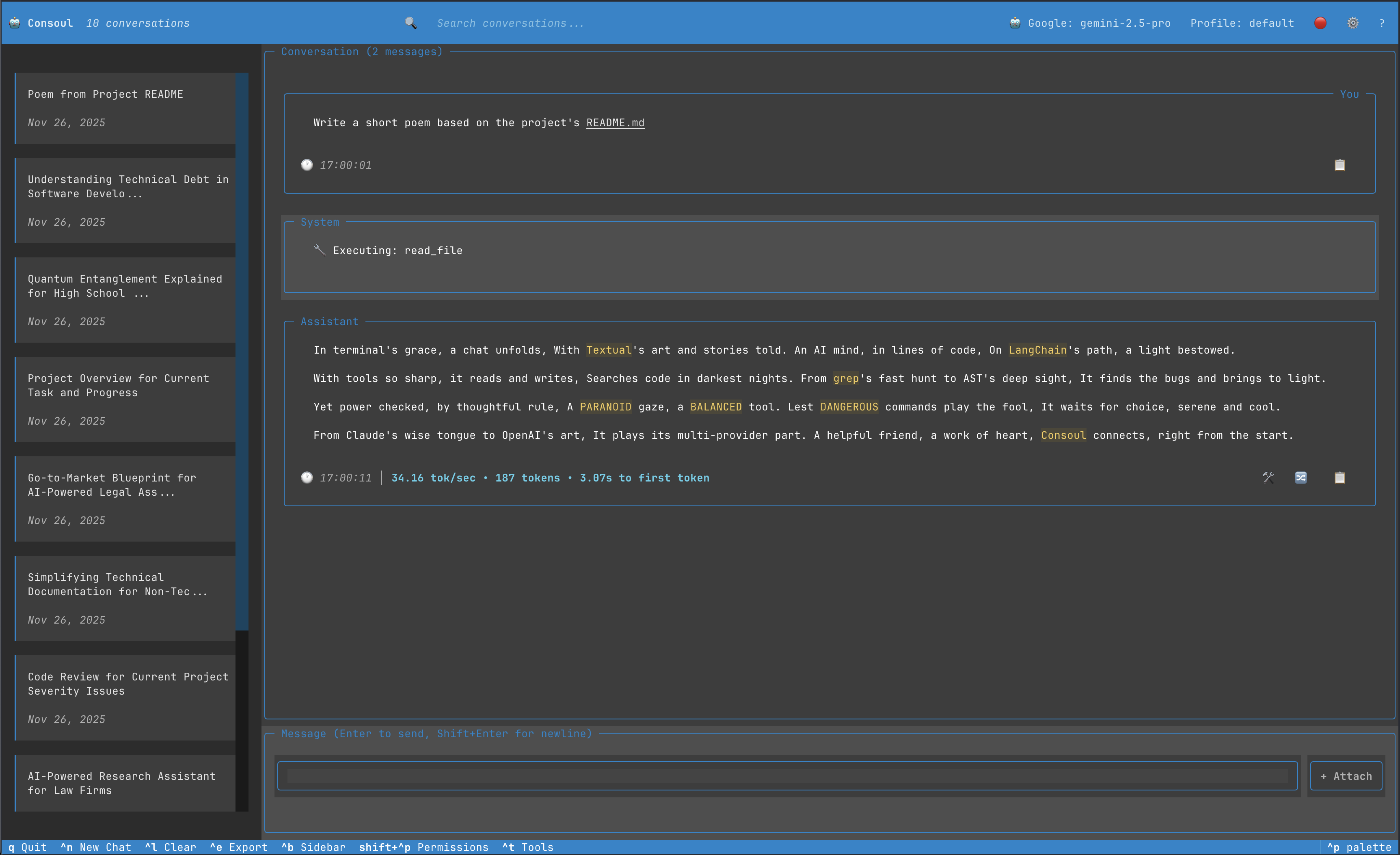 These themes are provided by the Textual framework and may not follow Consoul's brand guidelines, but they offer variety for personal preference.